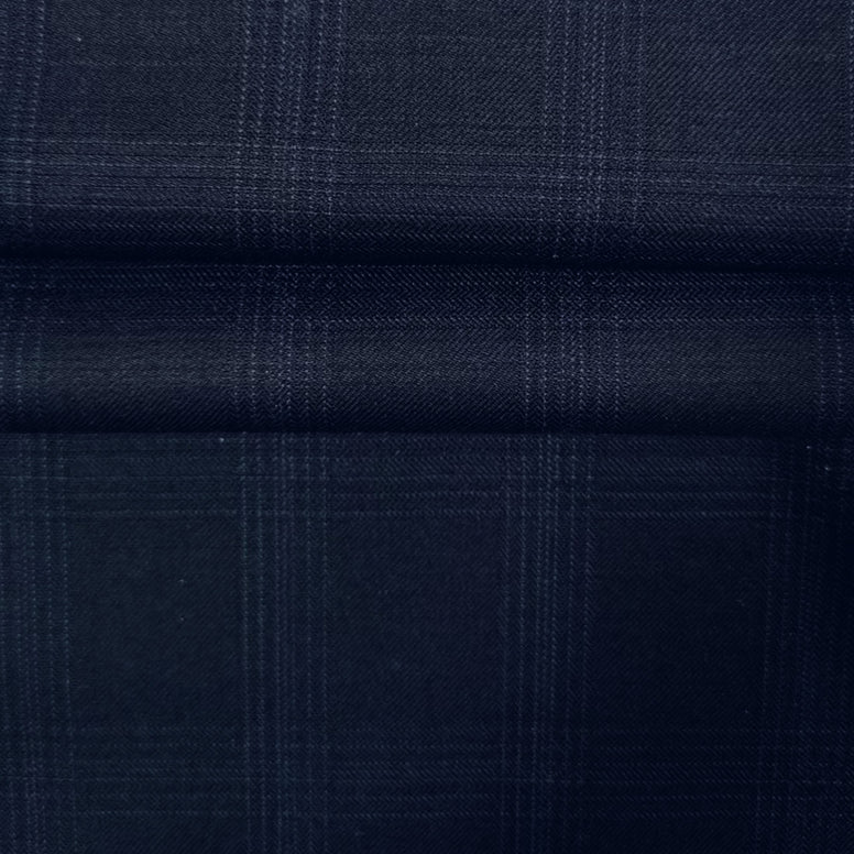 What am I? A refined, low-contrast Glen check with a micro-grid structure. Woven in a tight worsted twill, I provide a crisp, clean drape that is ideal for sharp tailoring and architectural suit designs.
