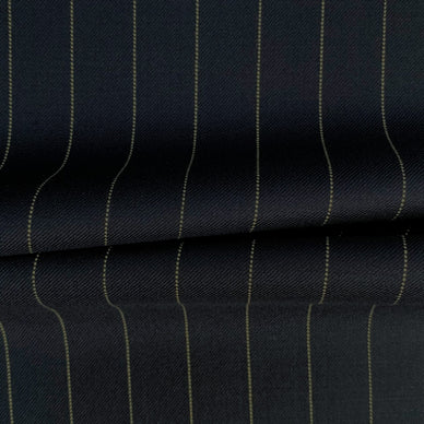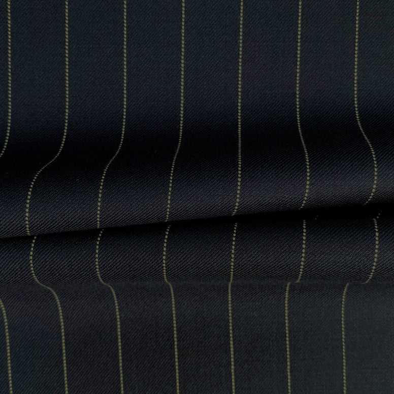 What am I? A powerful navy blue suiting featuring distinct, crisp white pinstripes. Woven at 275g/m, I offer the perfect weight for year-round authority, combining a sharp visual rhythm with a soft, worsted handle.